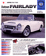 The Datsun Roadster features in the US collector card series HOT CARS, by International Masters Publishers. The 4 page article, which features Rob Beddington's Datsun 2000, both in the studio and on location, has a few text errors, but the photography is superb. The card reference number is 110 in the Sports Car Series. Please click on the thumbnails below for enlargements.