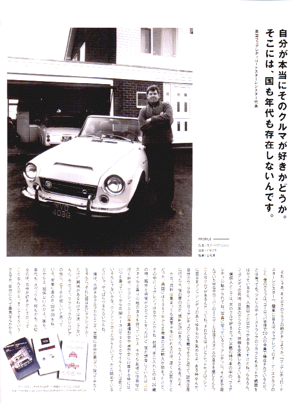 In December 1999 Rob Beddington was honoured by a visit from Japan by the Editor, the Art Director and a Photographer of NEO Magazine, the annual publication of Nissan Motorsports, Japan - the team were visiting England from Tokyo to interview BTCC NISSAN PRIMERA drivers LAURENT AIELLO (BTCC Champion 1999) and David Leslie (BTCC Runner-Up 1999), in addition to running a profile on The CLASSIC FAIRLADY ROADSTER REGISTER. The article was published in the 9th annual edition of NEO, which also includes listings of all Nissan Motorsports results in 1999. The visit was co-ordinated by Kazuo Hioki, Managing Director of Nissan Motorsports, Europe.