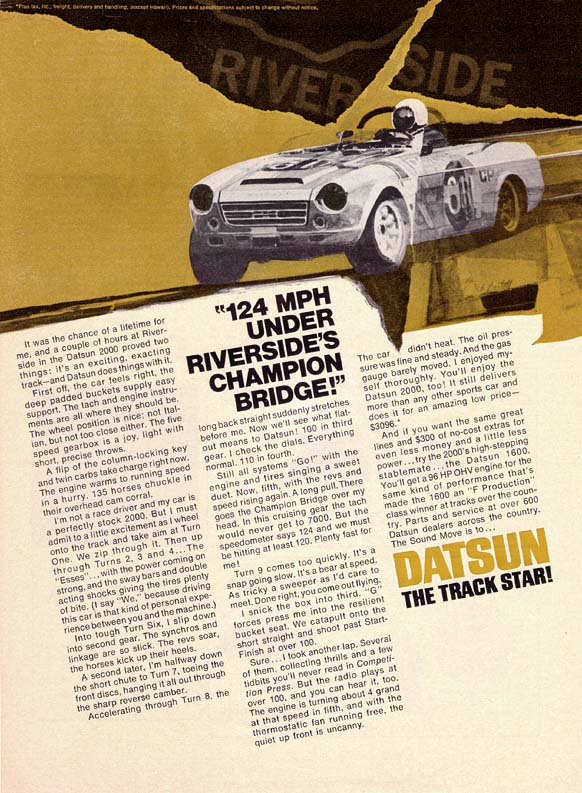 Nissan/Datsun Support - Mr Katayama JS- It is important to remember that Mr Katayama was the man primarily responsible for Datsun being active in racing in the USA. He was a racing enthusiast in the first degree. In addition, Lee Wiley, the National Service Manager and number two man at Gardena, was also very interested in racing. Datsun was very supportive all the way round, in that Mr Katayama frequently appeared in races in Southern California. Nissan never neglected us if we needed parts and never neglected our expenses. However, to Datsun's chagrin we did not accept their red white and blue race schemes. We went with the yellow car, which was a Triumph Spitfire yellow, with the black racing stripes. This was our signature. (Note - see how Datsun even changed the color of Jack's car in the 'Datsun sweeps the field at Daytona' ad to cream with red and blue stripes!). Although Datsun ran the Daytona ad, the Riverside ad (also featuring a disguised Scoville roadster) and the 'Driving the Ragged Edge' movie, I am disppointed that Datsun did not publicise their racing success like they did in the early days. I still believe that you race cars on a Sunday and sell them on a Monday and to do that you need to race a car that looks like the product you are selling. |