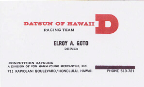In early 1964, following some success in a BMW 700, Elroy Goto was offered a ride in a Datsun 1500, obtaining sponsorship from VHY, the concessionaire for Nissan in Hawaii. He performed extremely well on the island, taking win after win, progressing through the Datsun 1600 (shown here) as well as the Datsun 2000. Elroy also raced on the mainland, using Jim Kellar's race car, and was fortunate also to drive a Datsun 2000 race car at the Fuji International Speedway in Japan.